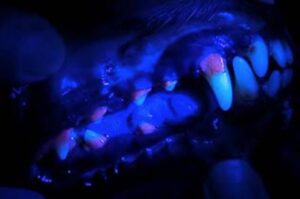 特殊なライトを当てて、歯石があるかどうかをチェックします。赤く光る部分が、歯磨きするだけでは落とせない歯石です。